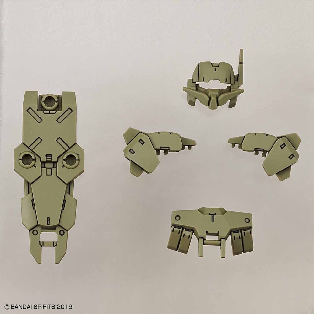 Line: 30 Minutes Missions (30MM). Scale: 1/144. Faction: Neutral. Material: PS. Colour: Dark Green. Contents: A close combat armour set that includes 2 reinforced shoulder pads, 1 front chest plate, 1 abdominal guard, 2 knee pads, and 1 set of connectors. Description: Designed for customising 30MM series model kits, particularly the Alto models.