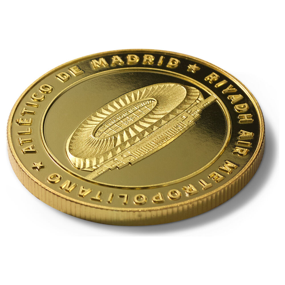 The Stadium Coin has a gold finish with embossed engraving on both sides. Made of zinc alloy (zamak), it comes protected in an acrylic capsule (Ø 4.5 cm) and presented in a display blister pack, perfect for gifts or shops. Coin dimensions: Ø 4 cm (approx. thickness 0.6 cm). Collector's item with no face value.