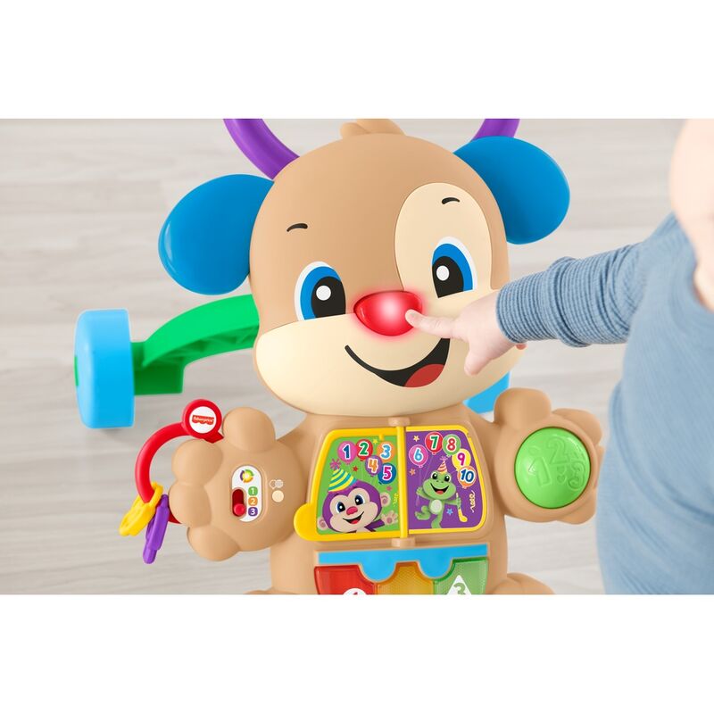 Age: 6-36 months. Musical toddler walking toy with 2 ways to play as baby grows: play sitting down or take your first steps! 3 levels of Smart Stages with over 75 songs, sounds and phrases teach the alphabet, shapes, colours, numbers and English words (English mode teaches French words). Easy-grip handle, sturdy 4-wheel base and 7 hands-on activities including piano keys and light-up nose, spinning, twirling and moving pieces, and more.