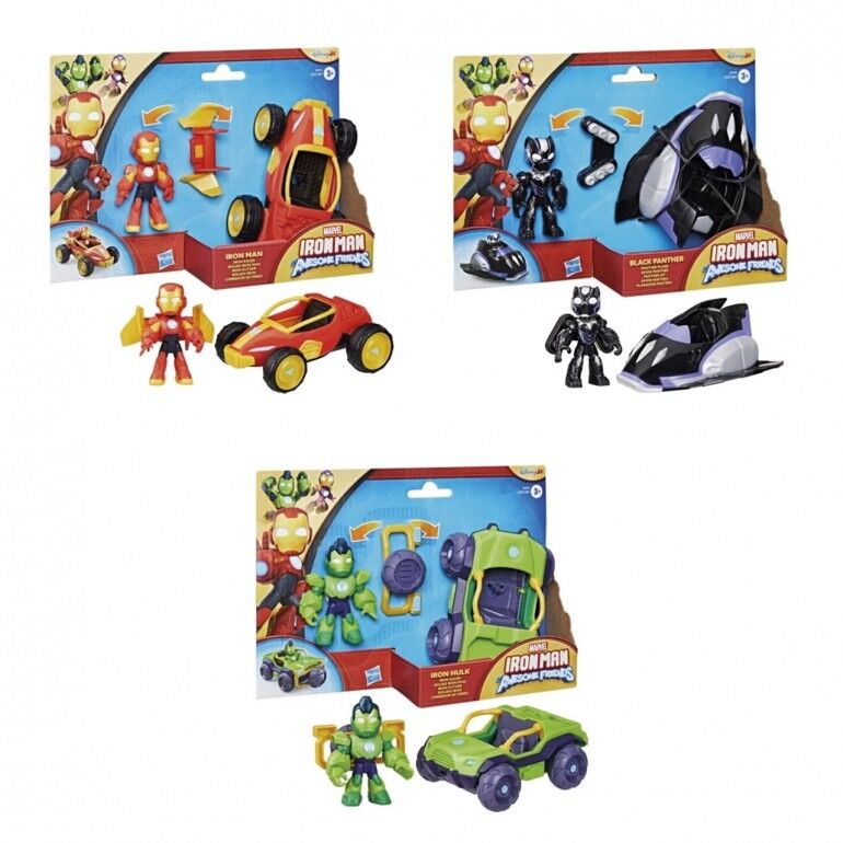 Edad: +3 años. ¡Únete al equipo Iron Man en sus más recientes aventuras con estos packs dobles de vehículo y figura Iron Man and his Awesome Friends! ¡Imagina que aceleras a la acción para salvar al mundo con figuras, vehículos y accesorios 2 en 1 compatibles con los vehículos y las figuras! ¡Cada vehículo de juguete (7,6 cm) viene con una figura articulada que cabe dentro de este! ¡Estimula el juego imaginativo lleno de aventuras en los niños y niñas a partir de 3 años con estos juguetes Marvel! ¡Busca más juguetes Iron Man and his Awesome Friends, incluyendo Iron Man con Bólido Iron, Iron Hulk con Bólido Iron, y Black Panther con Avión Pantera.