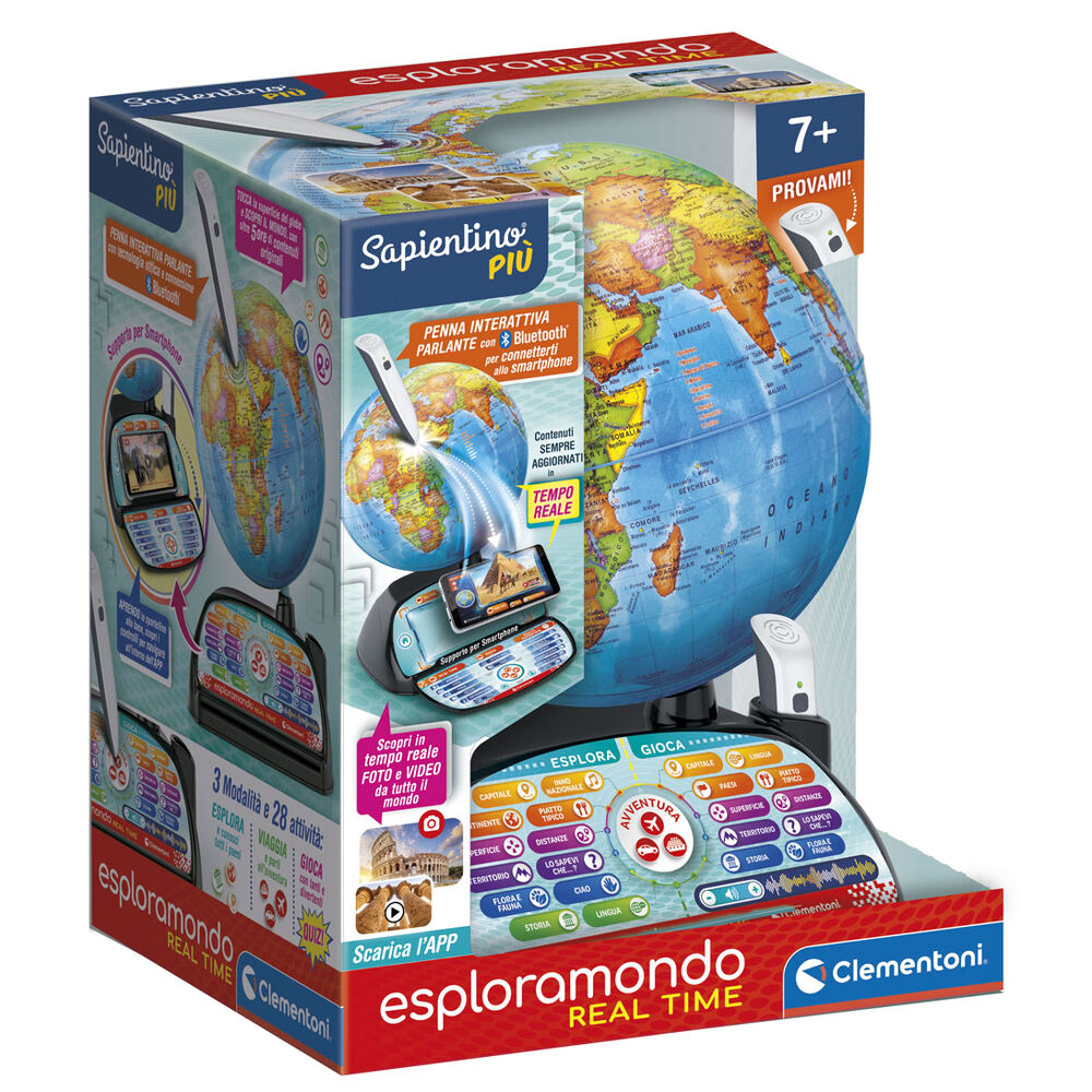 Edad: 7-10años. Tamaño: 35x40x28,5cm.El nuevo Exploramundo Real Time ofrece una gran cantidad de información y curiosidades ¡para aprender geografía de una forma innovadora y divertida!. Con el boli inalámbrico descubre Continentes, Capitales, Superficie, Flora, Fauna, Himnos Nacionales, Idiomas, Historia, Curiosidades, Platos Típicos y Distancias entre capitales y puntos de interés.¡Solo tienes que descargar la app para enterarte en tiempo real de lo que ocurre en el mundo a través de vídeos, fotos e información actualizada!. Para explorar, descubrir y aprender datos y curiosidades de cada país: ¡59 lugares de interés y 195 países, más de 5 horas de contenido y 28 actividades de juego!. El mapa específico del país propone información y curiosidades para revelar las características geográficas más importantes