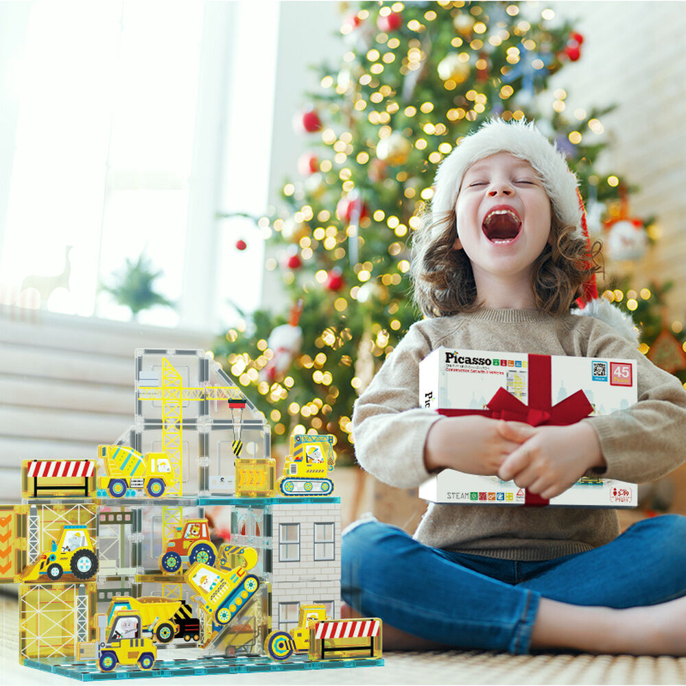 Age: 3+. Includes 7 triangles, 4 rectangles, 26 squares, and 8 vehicles to build the construction set or to be used with other Picasso Tiles magnetic building blocks as additional integrated pieces to offer open possibilities for unique design structures to nurture creativity and intelligence.