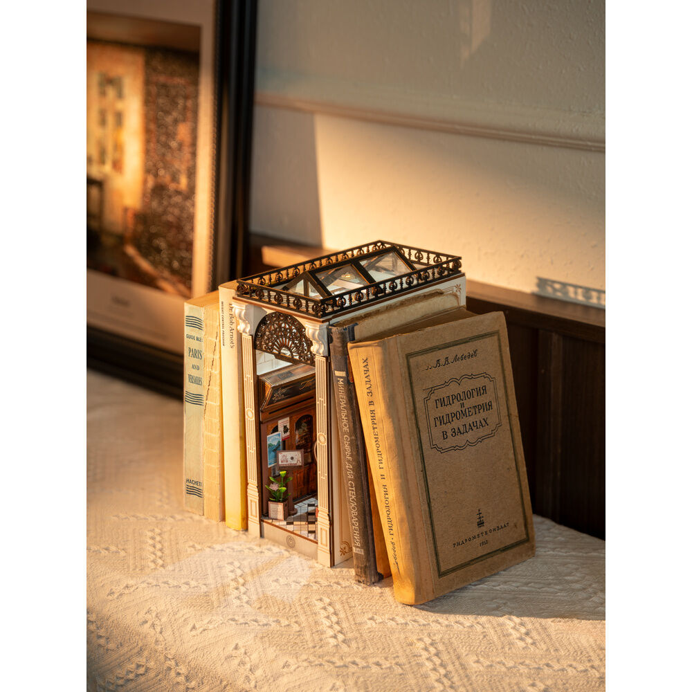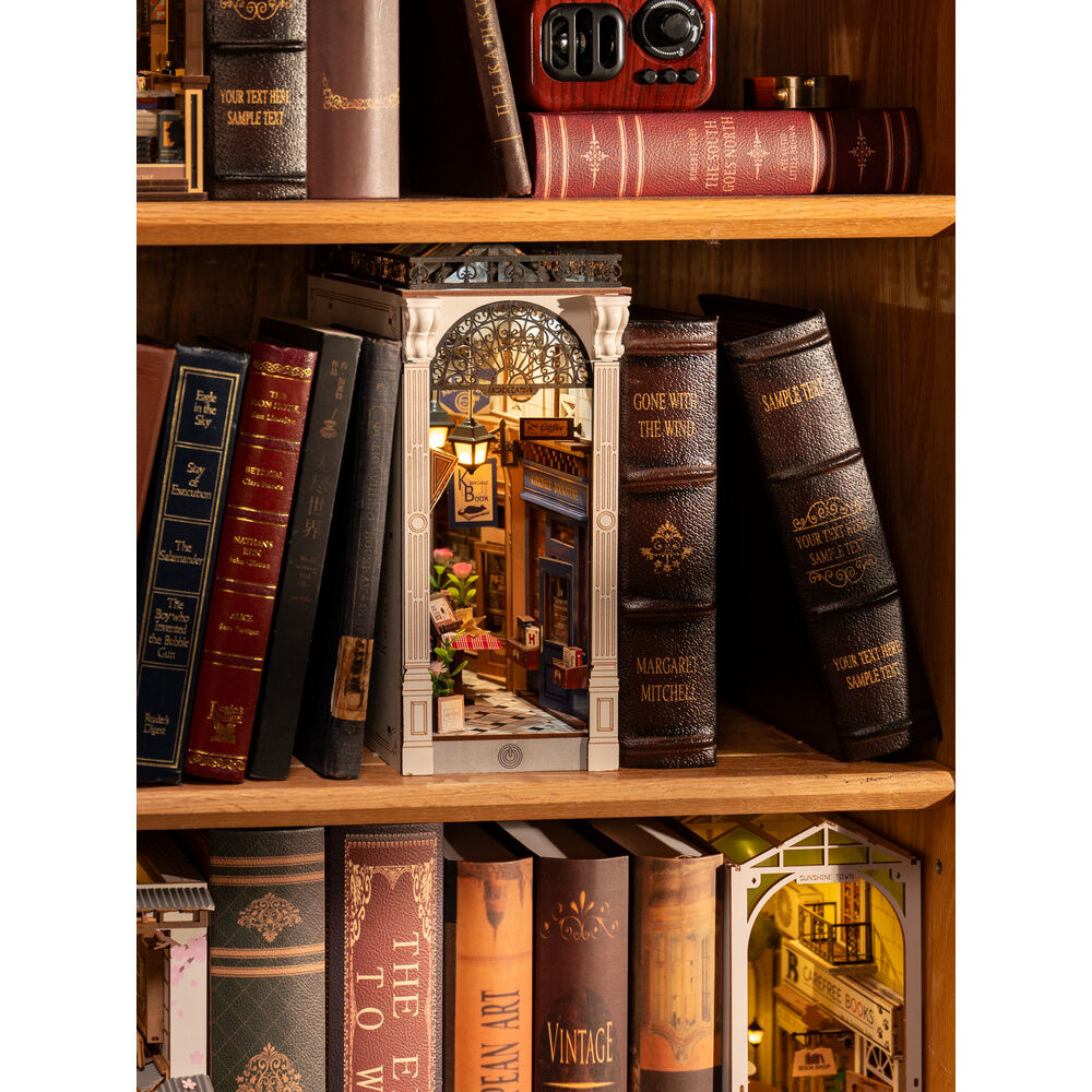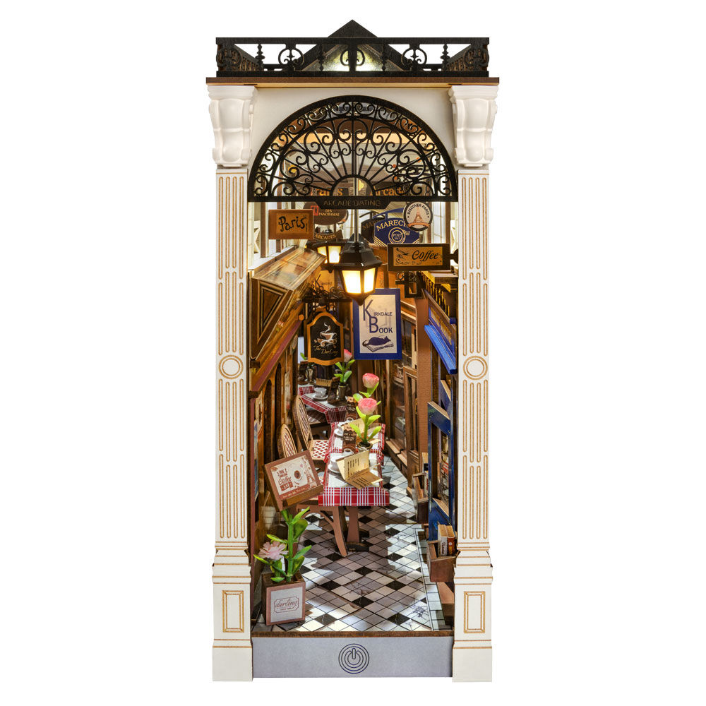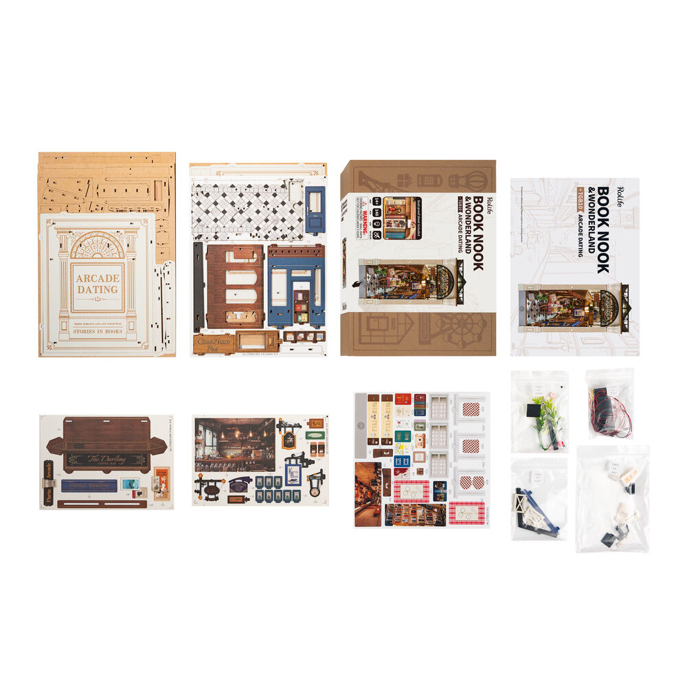 Sujetalibros. Tamaño: 10,6x19,5x25,5cm. Convierte tu estantería en una escena sacada de una novela romántica con Arcade Dating, el sujetalibros 3D de Rolife que combina creatividad y elegancia. Este precioso book nook te transporta a un pasaje europeo repleto de encanto: mesas con manteles de cuadros, cafeterías artesanales, flores, carteles vintage y una acogedora atmósfera iluminada por luz cálida LED.