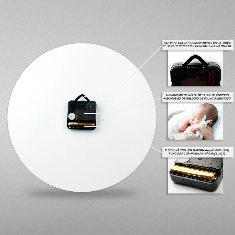 Glossy, reflective coating on the watch face. Elegant lacquered metal hands. Silent, floating clock mechanism. Diameter 30.5cm. Power supply with one AA battery (not included). Bracket for convenient wall hanging.