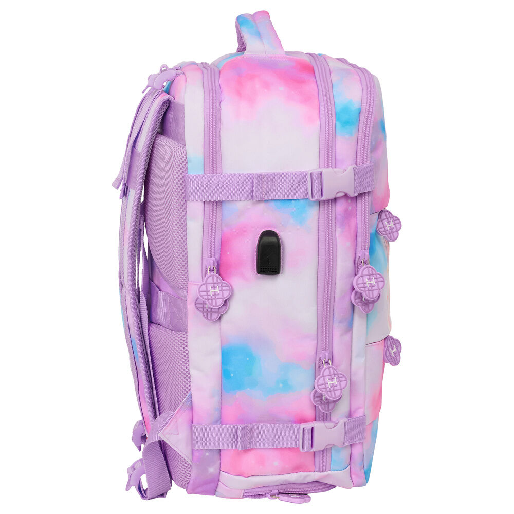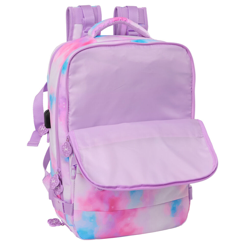 Las guerreras K-pop. Tamaño: 29x19x44cm. Primer Compartimento con cremallera de gran capacidad. Segundo Compartmento con organizadores interiores,bolsillo de red con cremallera. Tercer Compartimento para portatil de 15,6''. Bolsillo lateral portabotella. 2 Bolsillos frontales con cremallera. Doble cursor en los 2 compartimentos principales. Conector USB para cargar movil u otros dispositivos electrónicos. Zapatillero con cremallera en la base. Interior totalmente forrado y acolchado. Hombreras ergonómicas y acolchadas con rejilla transpirable. Espalda acolchada con rejilla anti-sudor con cinta adaptable al asa de la maleta. Cintas con cierre de PVC para mantener la mochila compacta.