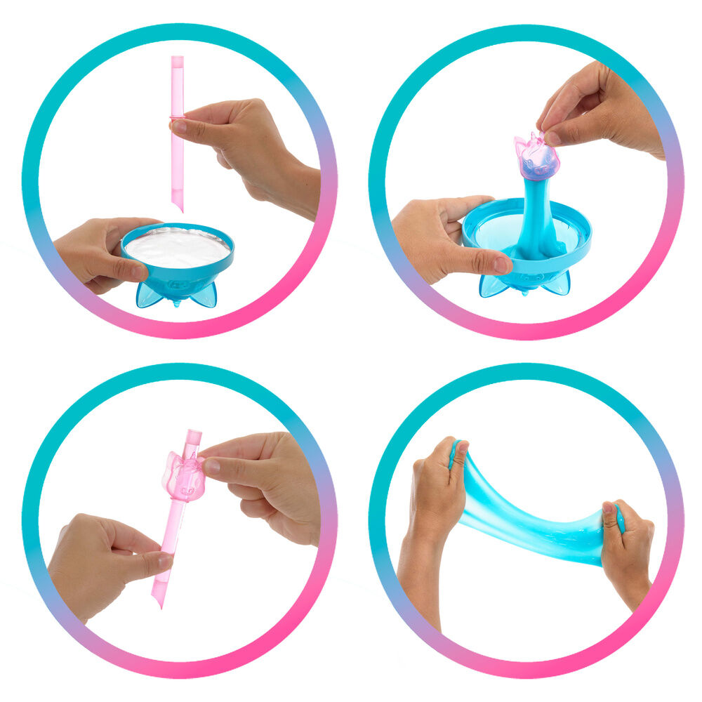 Edad: +3 años. Cada conjunto incluye ocho sorpresas, de modo que las muñecas de la Colección Batidos de Barbie Pop Reveal ofrecen una experiencia sensorial de lo más divertida con temática de batidos al desempaquetarlas. Desenrosca la tapa con forma de orejitas de animal con Slime brillante y utiliza la pajita para atravesar la película. ¡Verás qué blandito! Para seguir abriendo, retira el envoltorio del vaso y descubrirás una muñeca de moda Barbie Dulce unicornio con un olor relacionado con la temática de batido, articulaciones para colocarla en diferentes poses y una melena larga azul y morada. Encuentra los dos cubitos de hielo que se abren para descubrir las sorpresas de su interior: una falda de colores y un par de zapatos adorables. Puedes usar los cubitos de hielo para guardar los accesorios o divertirte descubriendo su contenido tantas veces como quieras. Las bolsas misteriosas contienen más accesorios para vestir a la muñeca o contar historias, como una mascota unicornio perfumada blandita, una cama para mascotas y una diadema con orejas de animal a juego para la muñeca.