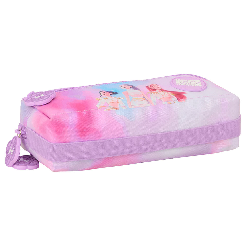 Las guerreras K-pop. Tamaño: 22x6x8,5cm. Tres compartimentos con cremallera. Con goma elástica trasera para acoplarlo al cuaderno o carpeta.
