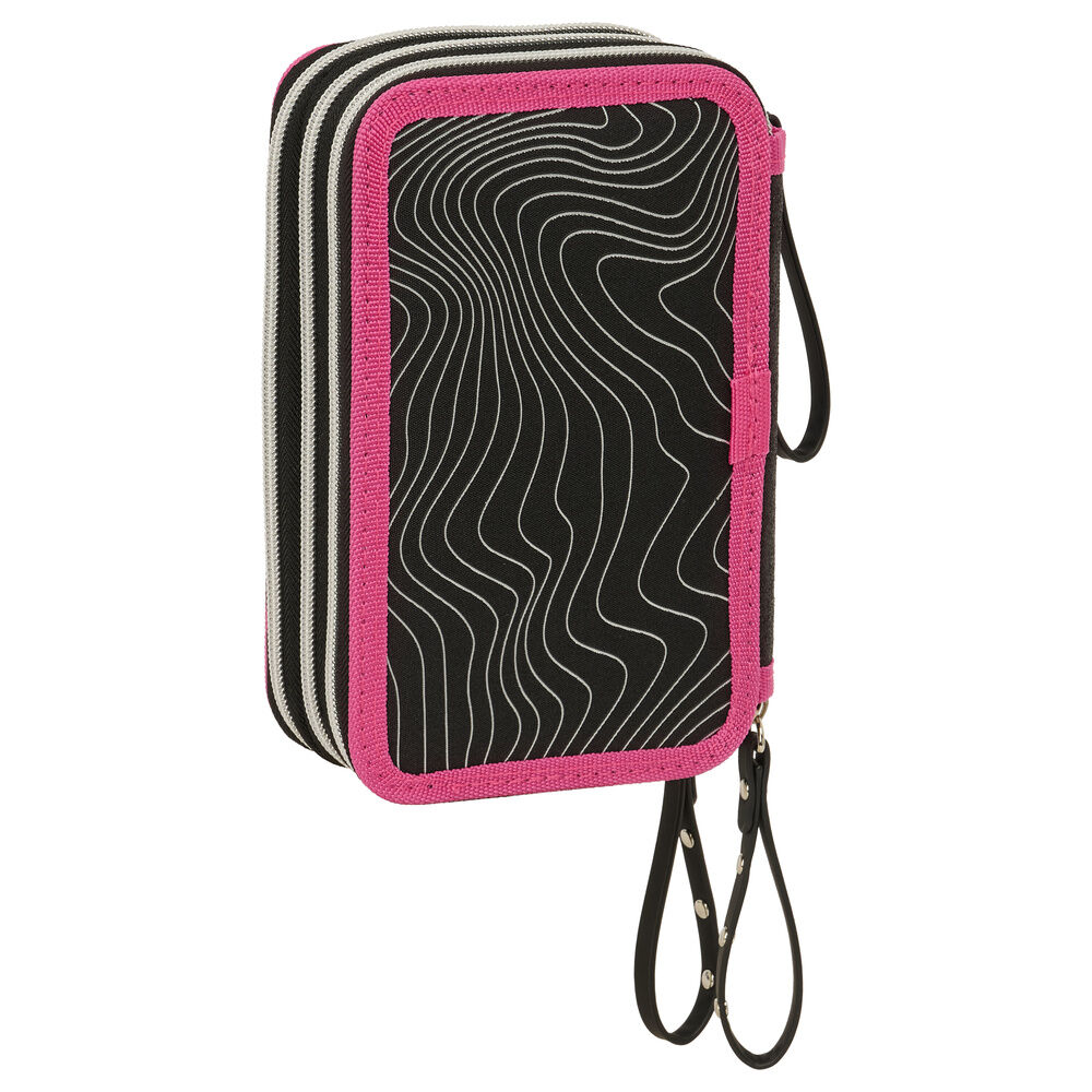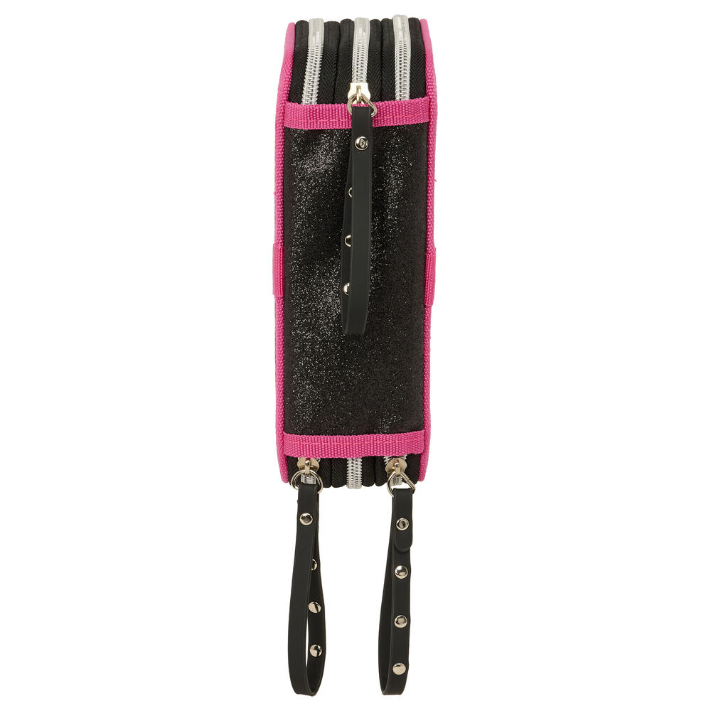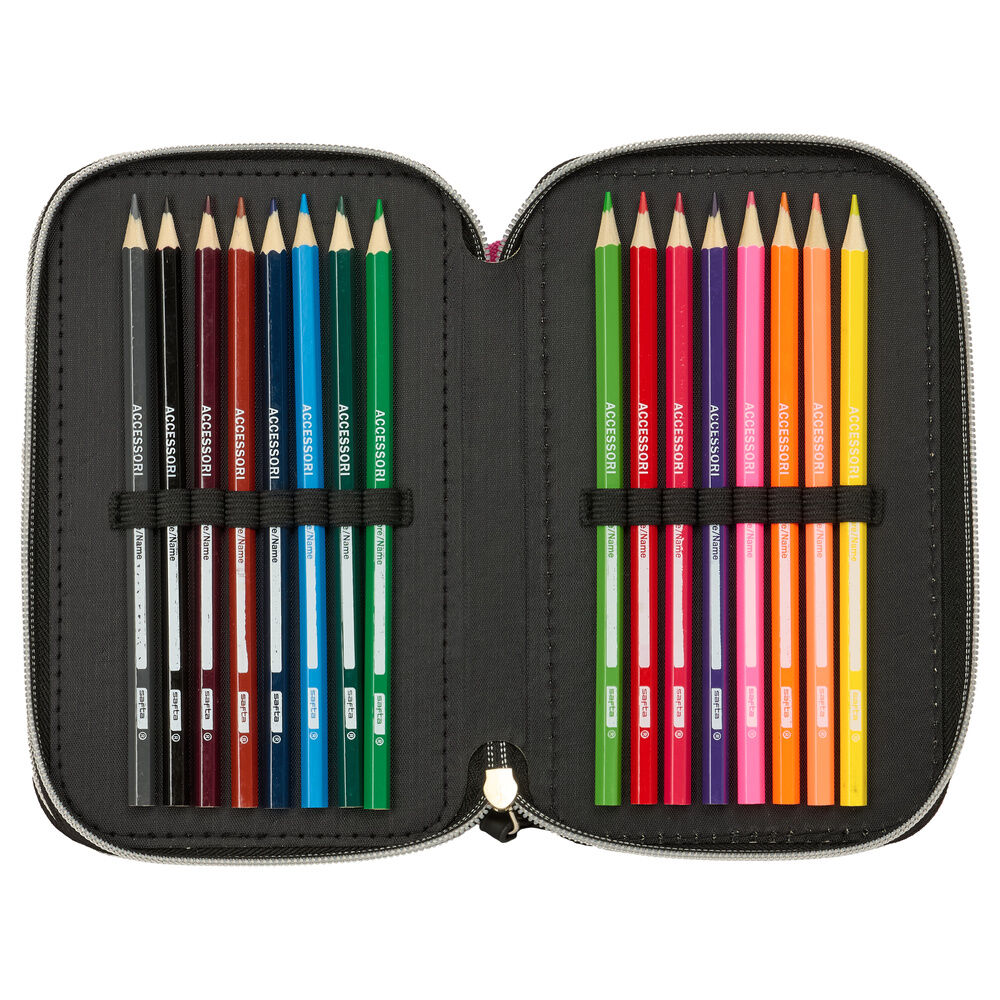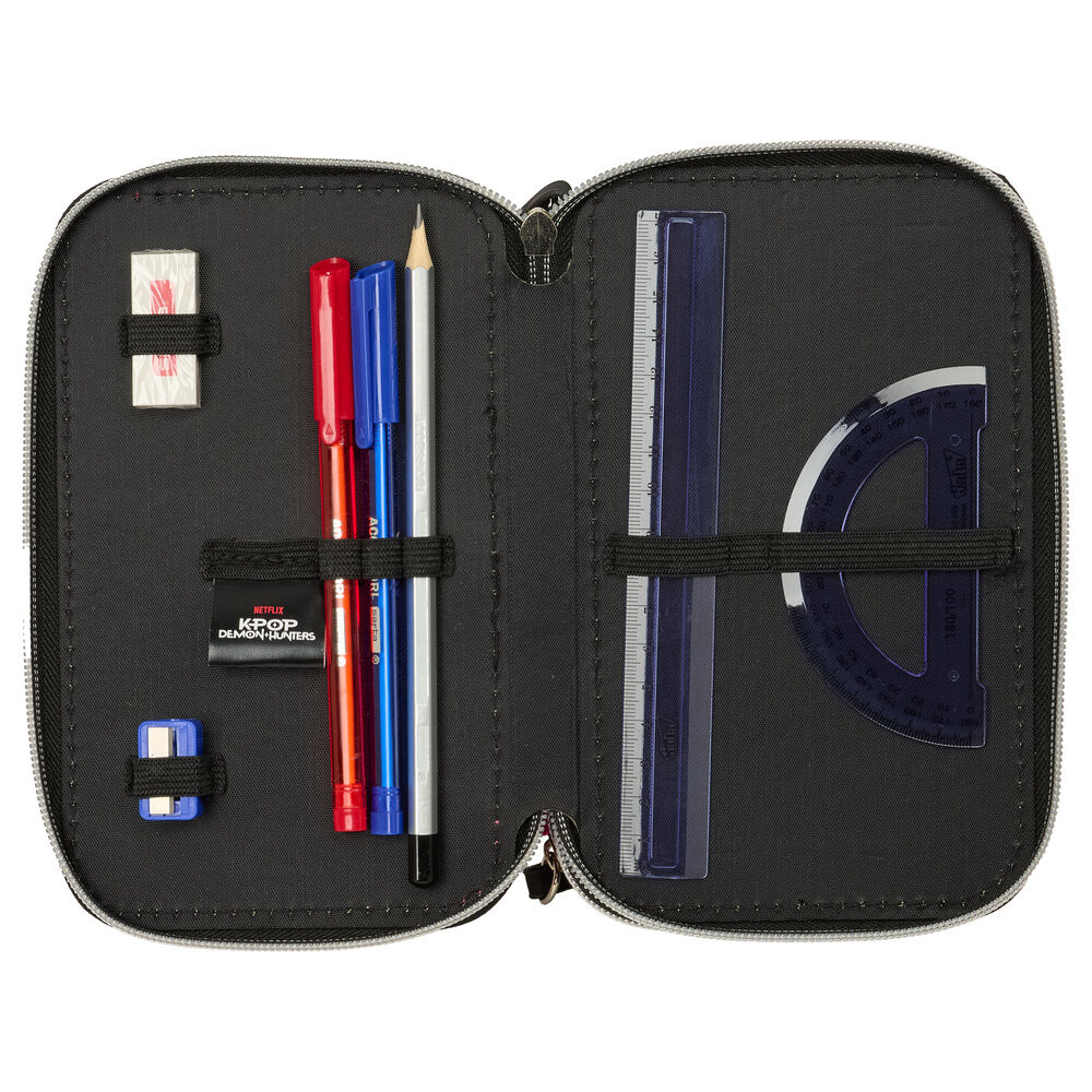 Las guerreras K-pop. Tamaño: 12,5x5,5x19,5cm. Contiene 37 piezas : goma, lápiz de grafito, bolígrafo azul-rojo, sacapuntas, regla azul grabada, y semicírculo (primer compartimento), 16 colorines de madera (segundo compartimento). 14 rotuladores de colores (tercer compartimento).