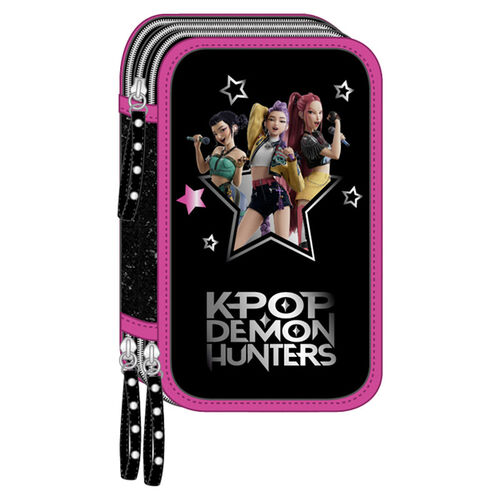 Las guerreras K-pop. Tamaño: 12,5x5,5x19,5cm. Contiene 37 piezas : goma, lápiz de grafito, bolígrafo azul-rojo, sacapuntas, regla azul grabada, y semicírculo (primer compartimento), 16 colorines de madera (segundo compartimento). 14 rotuladores de colores (tercer compartimento).