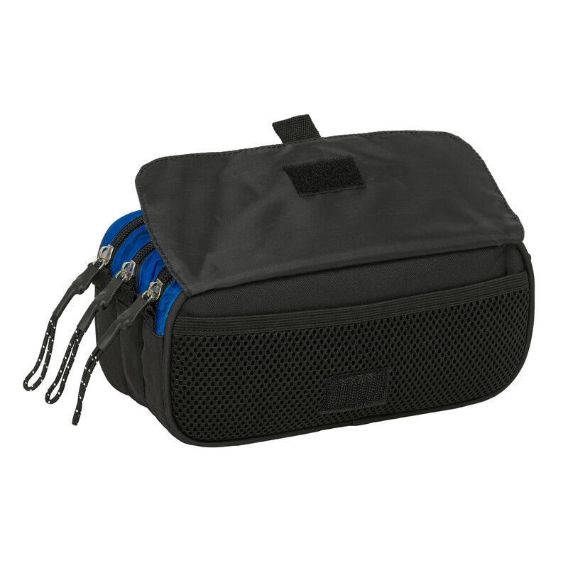 Tamaño: 21,5x8x10cm. Con tres compartimentos separados con cremalleras. Bolsillo frontal con cremallera. Cinta trasera adaptable a carro portamochilas.