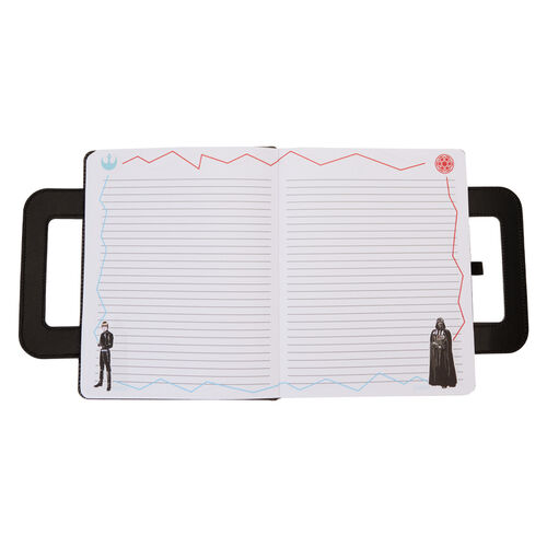 Size: 20x12,5cm. The Loungefly Return of the Jedi notebook is made of vegan leather (polyurethane). Additional features include frosted clear plastic, sticky note and printed details.
