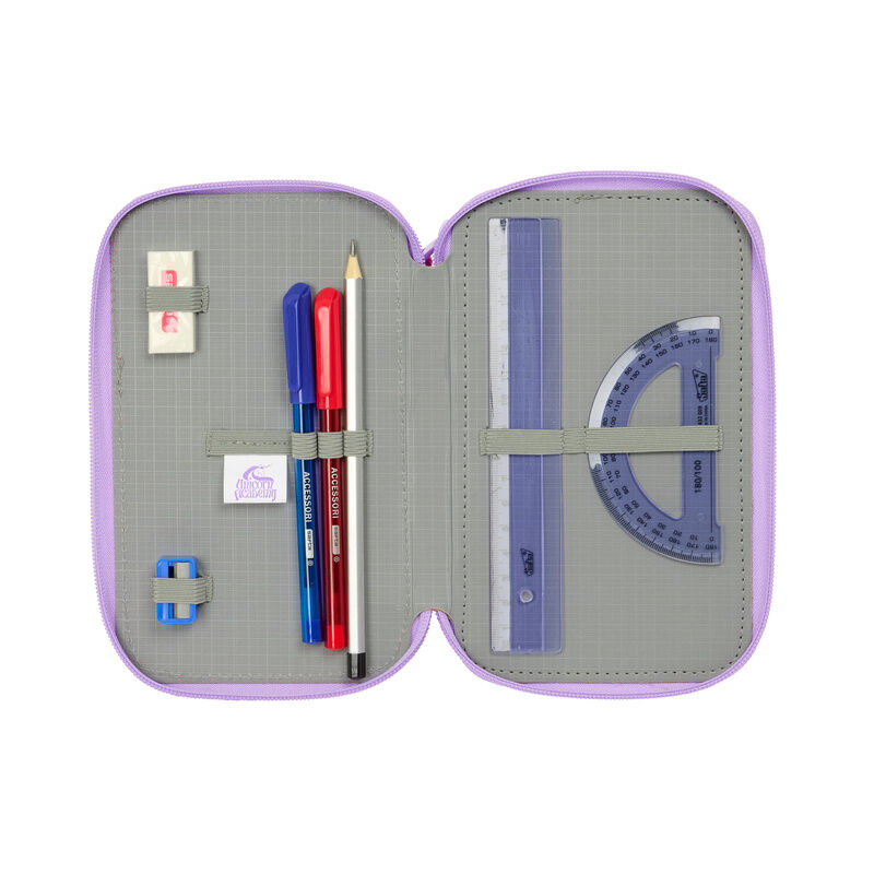 Size: 12.5 x 5.5 x 19.5 cm. Contains 37 pieces: eraser, graphite pencil, blue-red pen, pencil sharpener, engraved blue ruler, and semicircle (first compartment), 16 wooden coloured pencils (second compartment). 14 coloured markers (third compartment).