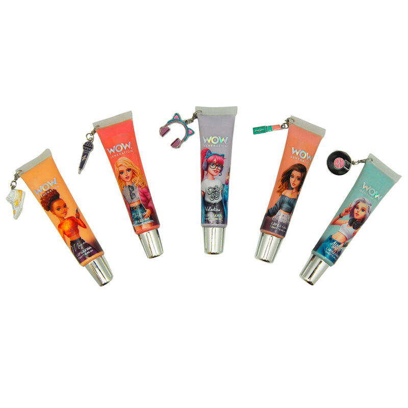 Lip gloss with decorative charm. With 5 different colours, Lilac with headphones charm, Light pink with lipstick charm, Turquoise with vinyl record charm, Orange with slipper charm, Fuchsia with microphone charm.